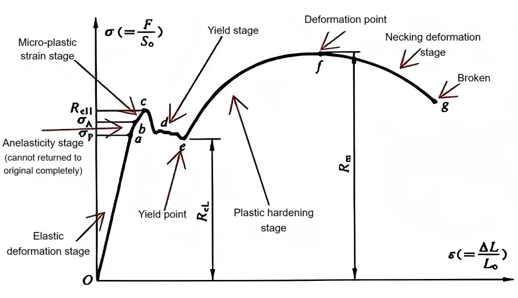 When the external force exceeds the elastic limit of the material, the material will undergo plastic deformation, that is, after unloading, the material retains some residual deformation. When the external force continues to increase to a certain value, the phenomenon occurs where the sample continues to elongate even though the external force does not increase or even decreases. This is manifested on the stress-strain curve as a plateau or sawtooth-shaped peaks and valleys, and this phenomenon is called the yield phenomenon. The force at the plateau stage is the yield force. The force before the first drop when the sample yields is called the upper yield force, and the minimum force during the yield stage without considering the instantaneous effect is called the lower yield force. The corresponding strengths are yield strength, upper yield strength, and lower yield strength.